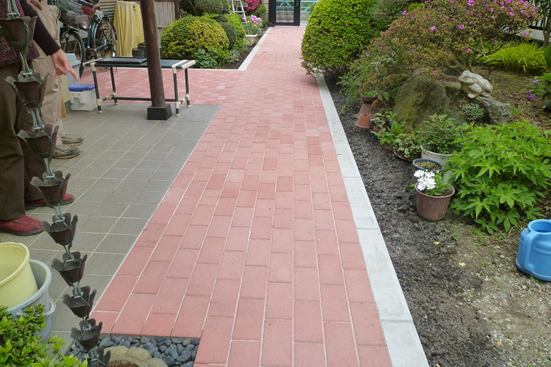 道路から玄関ポーチまでのアプローチ、敷石の浮き沈み(段差)がある為に、自転車乗り降り、歩行が困難な状況を解消するために、滑りにくい表面、多彩なカラーをラインアップし、インターロッキングにて多少のスロープを付けて工事を行いました。